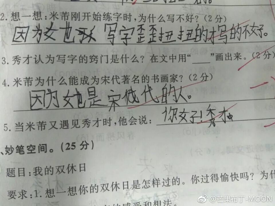 五一假期前,不少中小学都进行了期中考试。现在,假期过完了,考试卷子也发下来了。到家长在盆友圈里晒孩子成绩单的时间了。可一圈刷下来发现:这哪里是晒成绩单啊,这简直是大型段子手现场。