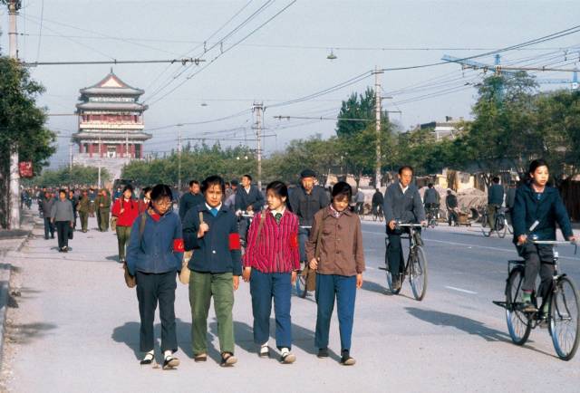 1976年,北京,西单北大街,学生们在等候校车。马达罗/摄。