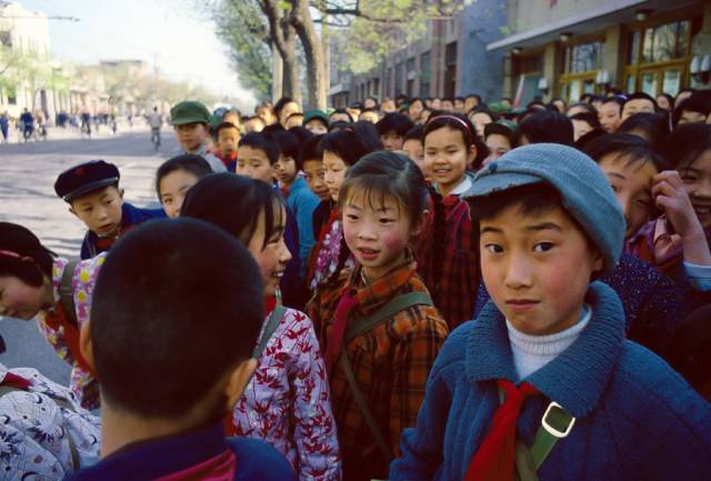 1978年冬,北京芳草地,围观外国人拍照的孩子们。