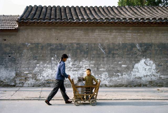 1976年,北京,一位妈妈将孩子和煤气罐放在儿童车内,推着飞快前进。马达罗/摄。