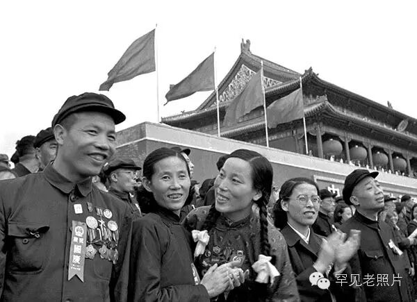 1954年10月1日,北京,出席第一届全国人民代表大会的劳动模范李顺达(前左一)、申纪兰(前左三)以及刘胡兰烈士的母亲胡文秀(前左二)在天安门观礼台上。