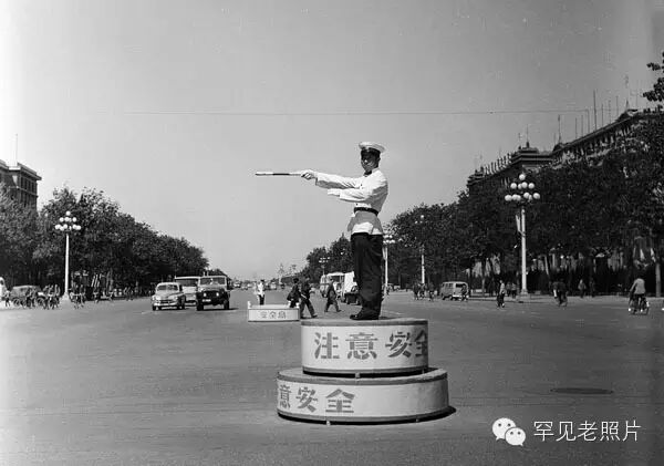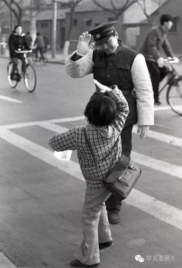 1981年,北京西四街头,西四交通支队交警每天在此路口护送小学生过马路。