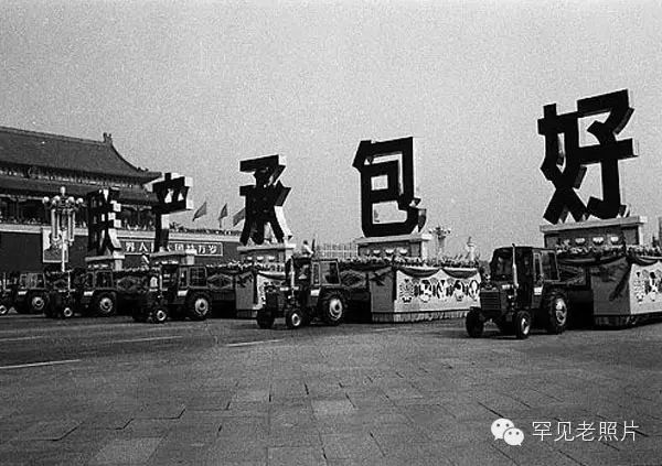 1984年10月1日,北京,国庆游行的标语"联产承包好"。
