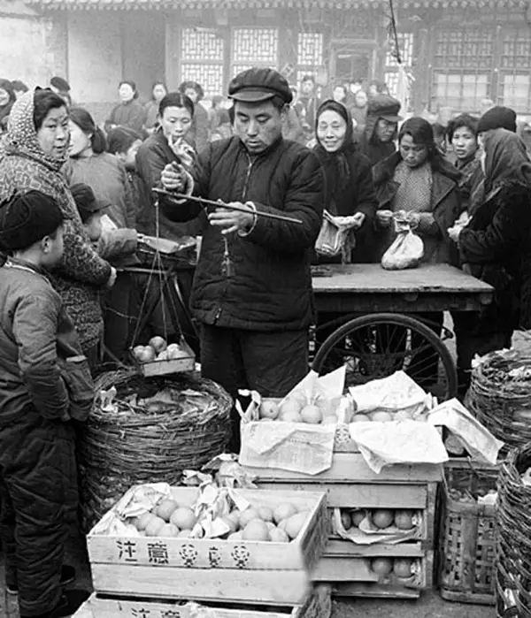 1958年春节,北京市宣武区留学路副食品商店出动流动售货车为居民服务。