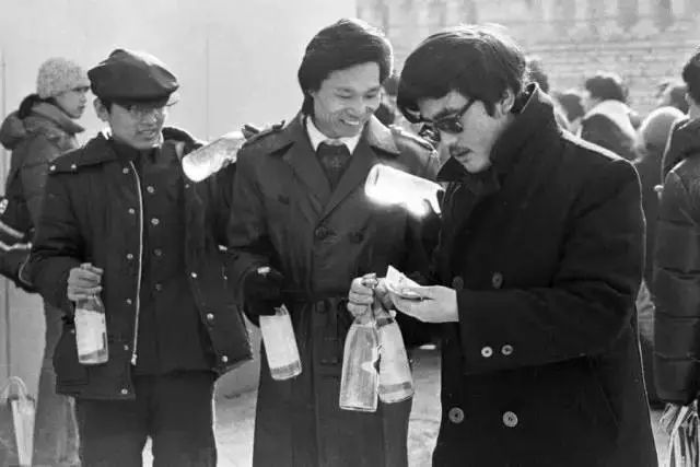 1987年春节前夕,北京,年轻人排长队买到酒喜出望外。蒋铎/摄。