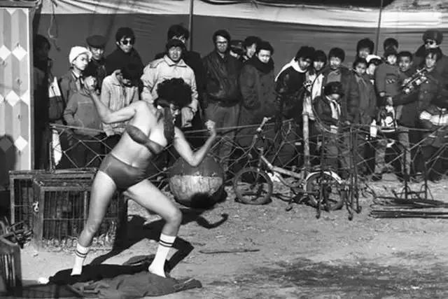 1985年,北京地坛公园,第一届春节文化庙会上,一女子寒冬里身着泳装表演绝活。