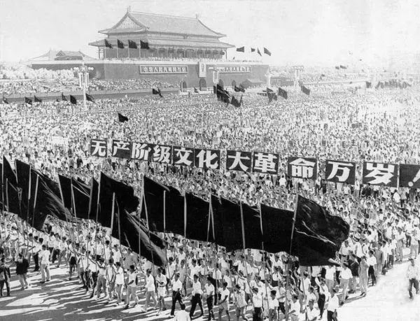 1966年10月,北京,毛泽东、林彪与"革命小将"们在一起。