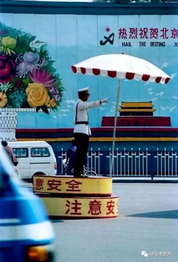 1990年,北京交警。拍这张照片时,北京已经成功举办完亚运会,交警旁边墙上的海报有第11届亚运会logo。