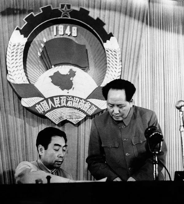 1950年,毛泽东和周恩来在政协一届二次会议上。吕厚民/摄。