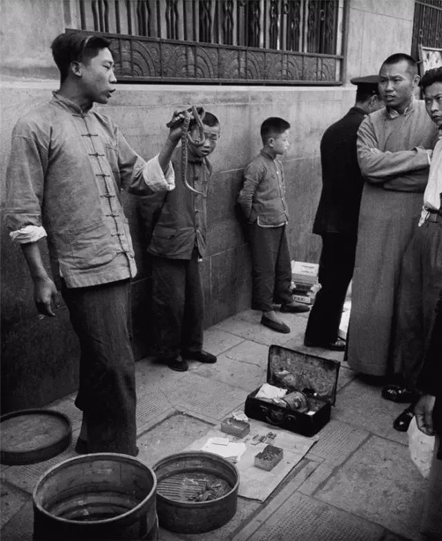 1948年5月,上海,路边的小贩在兜售活蛇和中成药。