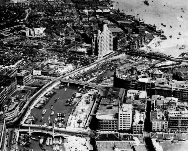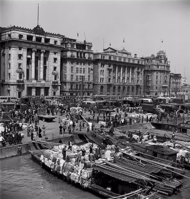 1948年3月,上海,装满美国棉花的驳船停泊在码头区。