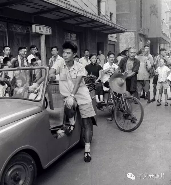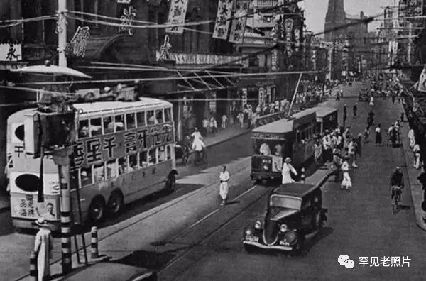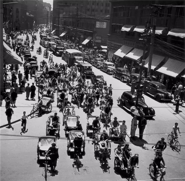 1948年5月,上海,在拥挤的商业区大街两旁,汽车和三轮车各行其道。