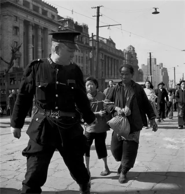 1948年3月,上海,警察抓住了一位偷棉花的妇女和她的女儿。