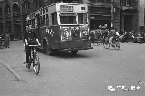 1949年,上海公交车上的毛泽东(右)和朱德(左一)海报画像。哈里森·福尔曼/摄。