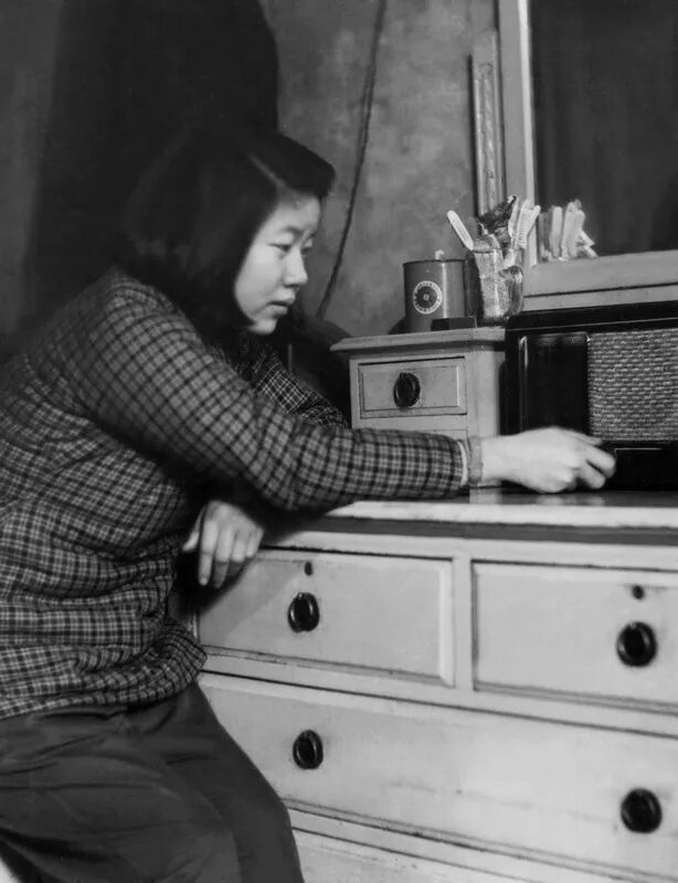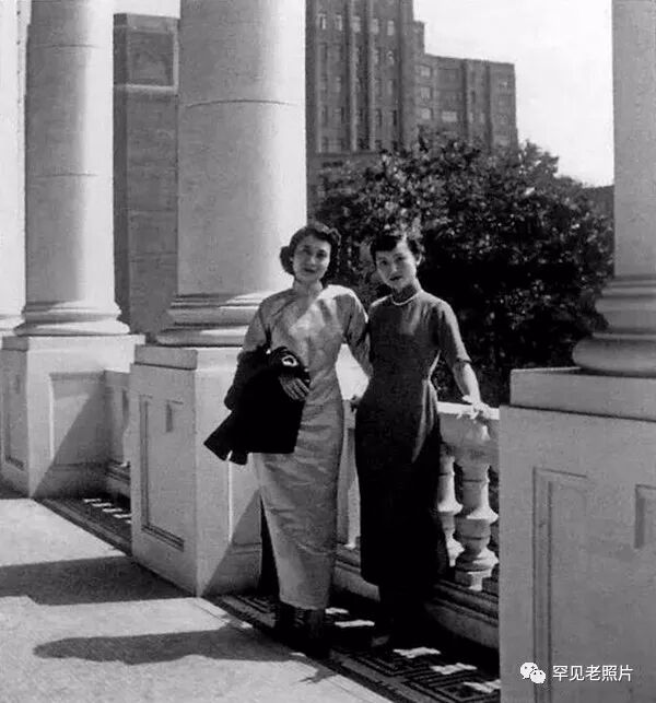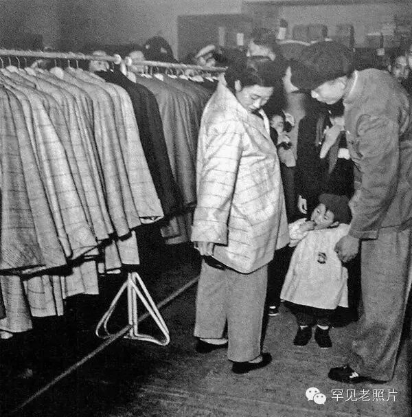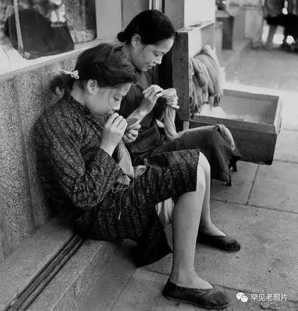 1948年5月,上海,一位年轻姑娘跟妈妈一起在外侨居住区摆摊缝补衣服。