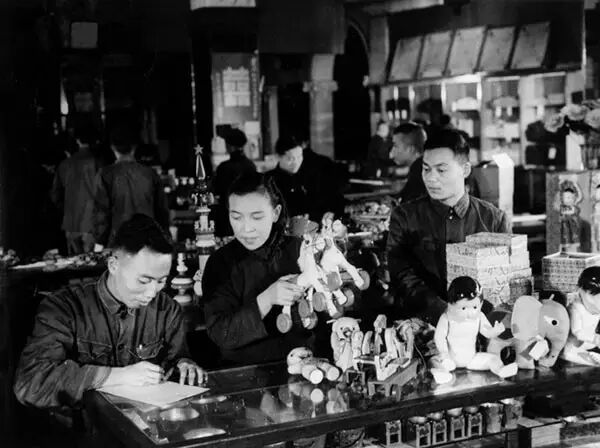 1955年,上海,永安公司批准公私合营后,职工们积极进行资产清点工作。图为玩具部的职工在清点玩具。