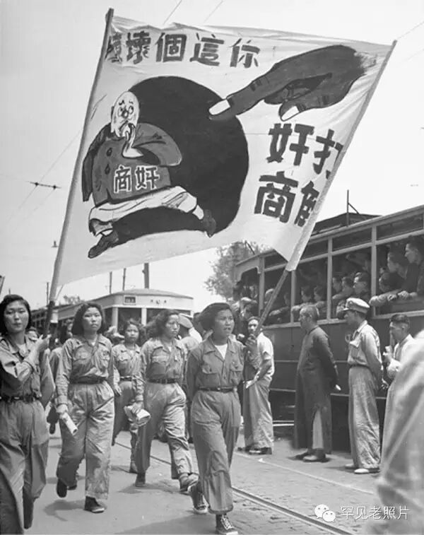 1948年,上海学生走上街头,高举"打倒奸商"的旗帜。