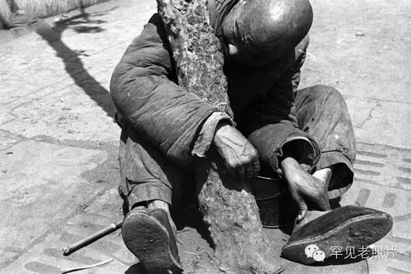1949年,上海,一个乞丐在英国大使馆门前饥饿痛苦的啃树皮。
