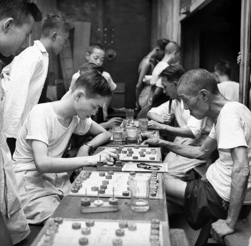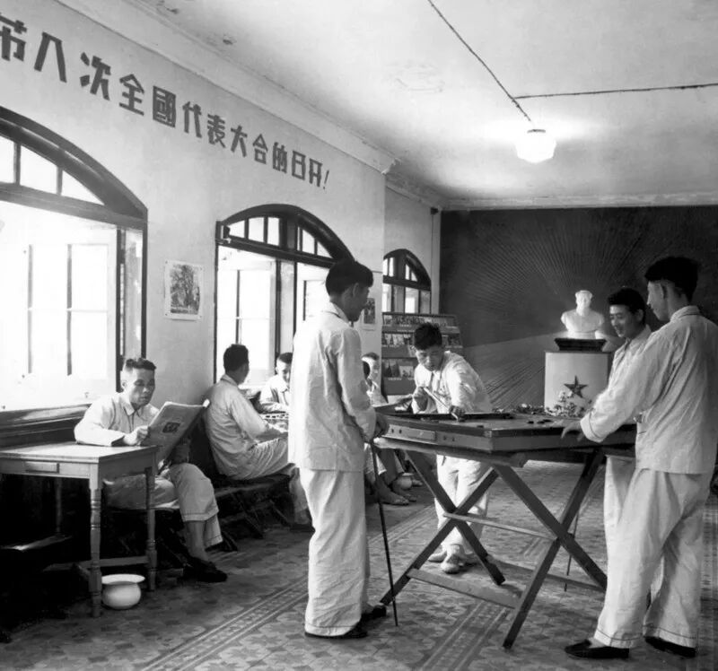 1956年,上海,码头职工疗养所内几位工人打桌球。