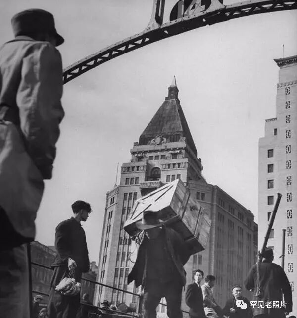 1948年,上海,挑担工站在丝袜美女前,让摄影师给拍一张。