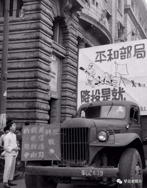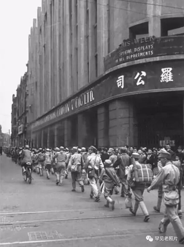 1949年5月,上海,国军士兵经过惠罗公司开往吴淞前线。
