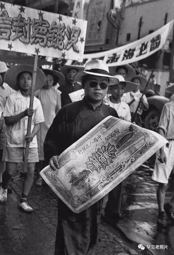 1949年8月1日,上海,游行的工会代表手拿新发行的纸币。布列松/摄。