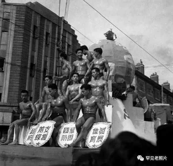 1950年,上海淮海中路与茂名路口,上海解放周年庆游行,游行彩车上健美运动员展示他们的身材。