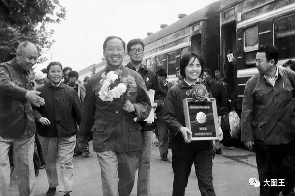 无锡县柴油机厂生产的柴油机在全国质量评比中荣获国家最高质量奖,这是职工到无锡火车站迎接该厂代表手捧奖牌从北京归来。