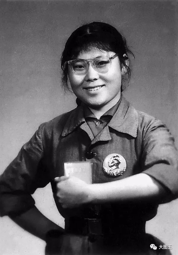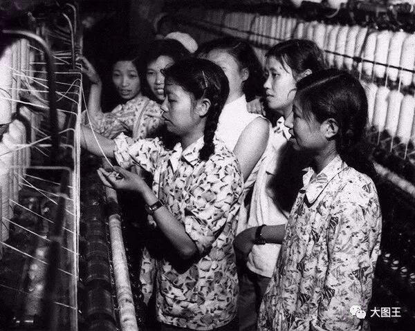 无锡,全国劳模、申新纺织厂细纱工殷美娣正在操作示范。大约拍摄于20纪50年代末60年代初。杨世骏/摄