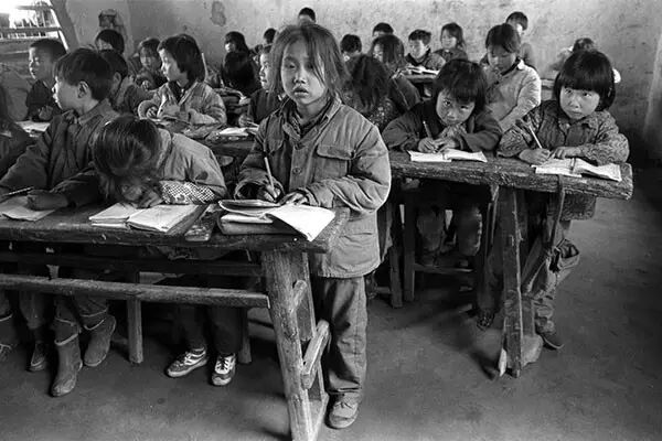 这是解海龙拍摄的希望工程照片:1992年3月,山西省静乐县赤泥洼乡羊丈村,娃娃们扛着桌凳去上学。