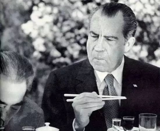 1972年尼克松访华。尼克松认真地看周恩来总理如何使用筷子。