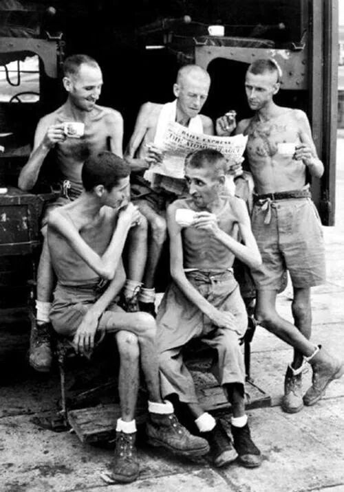 5名被日本囚禁在新加坡的澳大利亚战俘。原本身体魁梧的澳洲军人竟被折磨的骨瘦如柴了。