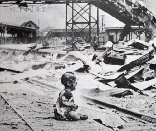 日军轰炸上海火车北站的情景,一个中国小孩在废墟中无辜地哭喊着。