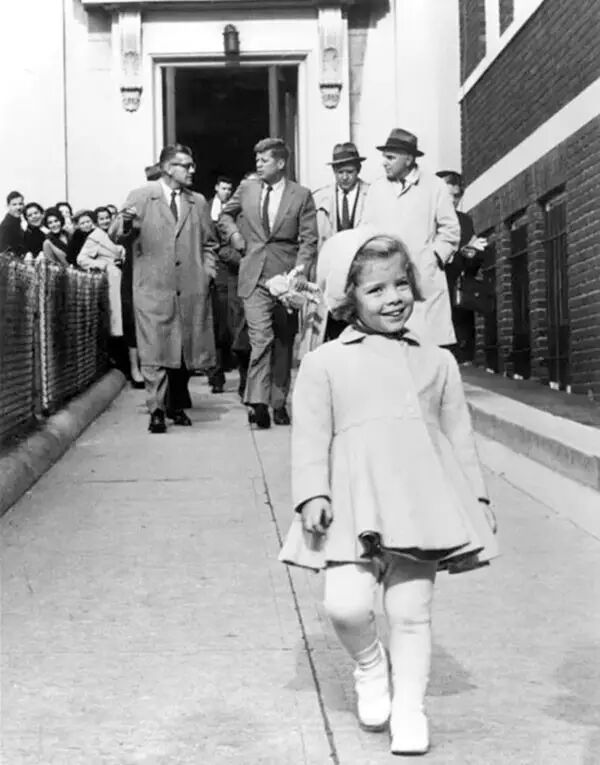 1963年,卡罗琳·肯尼迪开心地走在前面,后面走着的肯尼迪总统手上还拿着她的洋娃娃,几个月后她就成为失去父亲的孤儿。