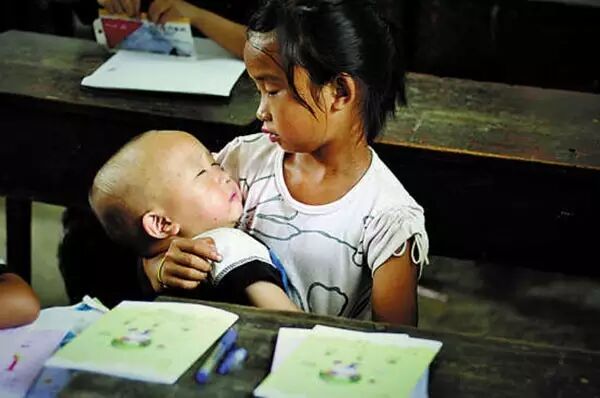 2011年7月21日,湖南凤凰县山江镇好友小学课堂上,留守姐姐抱着弟弟听课。卢七星/摄。