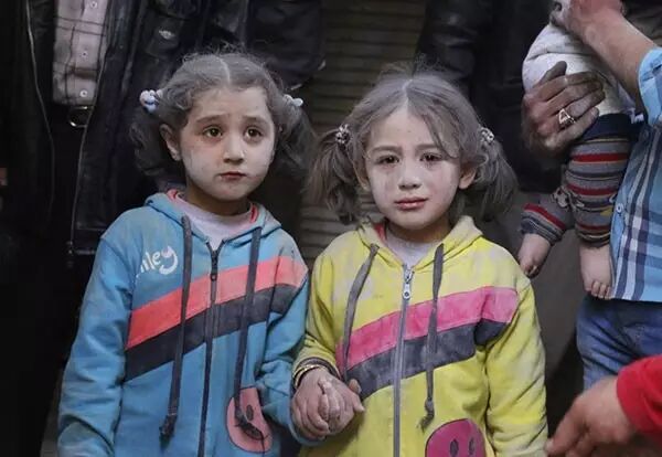 2015年,叙利亚西北部城市阿勒颇,两位躲过导弹袭击的女童手拉手。
