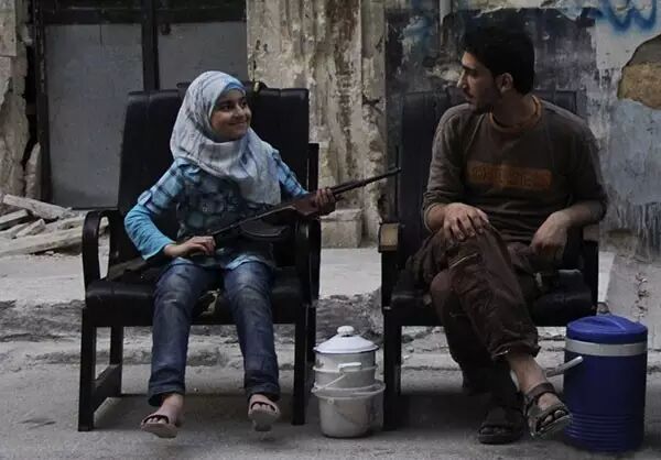 2012年,叙利亚,女孩手持枪支和反政府的解放敘利亚军坐在一块儿。
