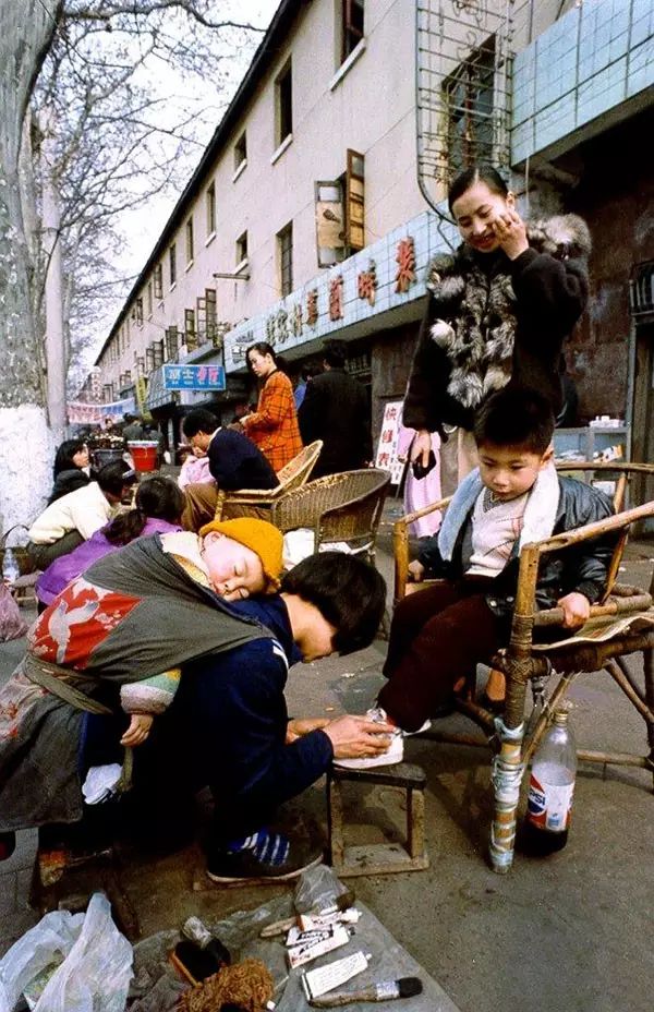 同在一片天空下,一个背着孩子的母亲专心地给另一个富有的孩子擦皮鞋。照片大约拍摄于2008年。