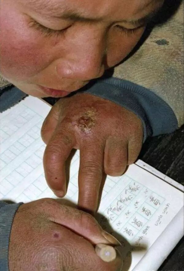 中国西北某地贫困学校一小学生用冻裂的双手在写作业。照片大约拍摄于1997-2003年之间,王博/摄。