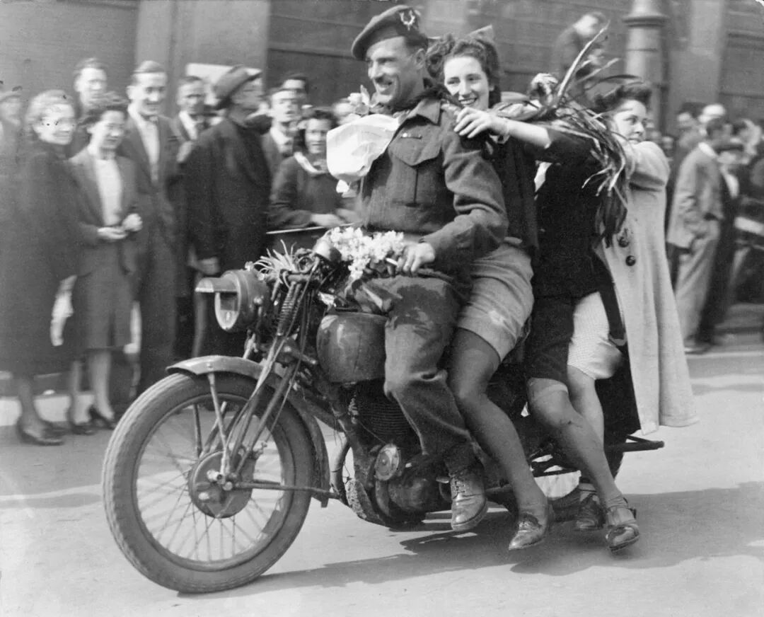 1945年,一名加拿大士兵在荷兰阿姆斯特丹与三名女士一起骑摩托车。