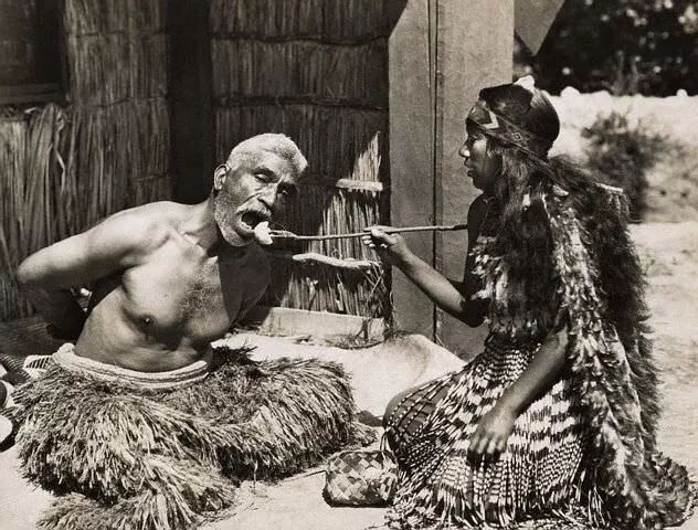 1930年,新西兰,一名毛利牧师给村民喂食。