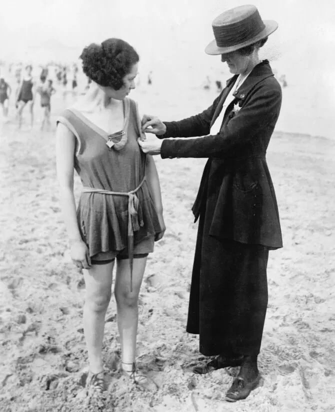 1920年,美国,一位沙滩警察检查女子的泳衣。