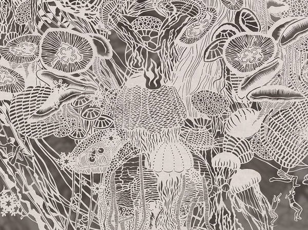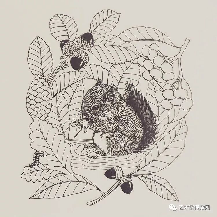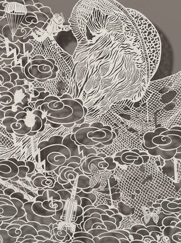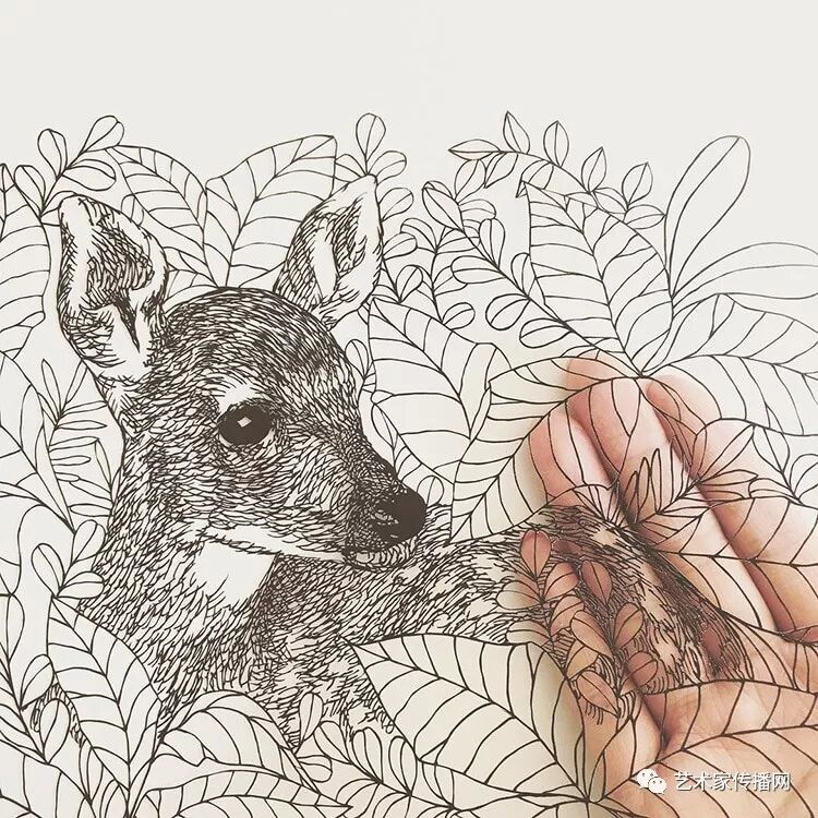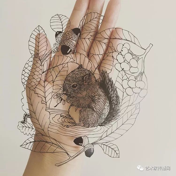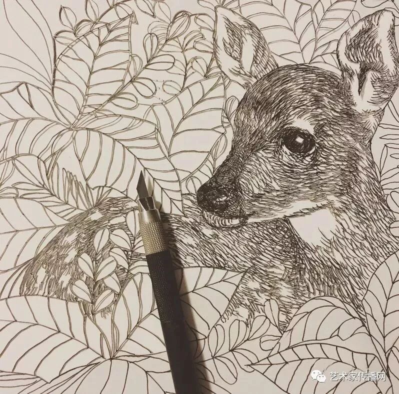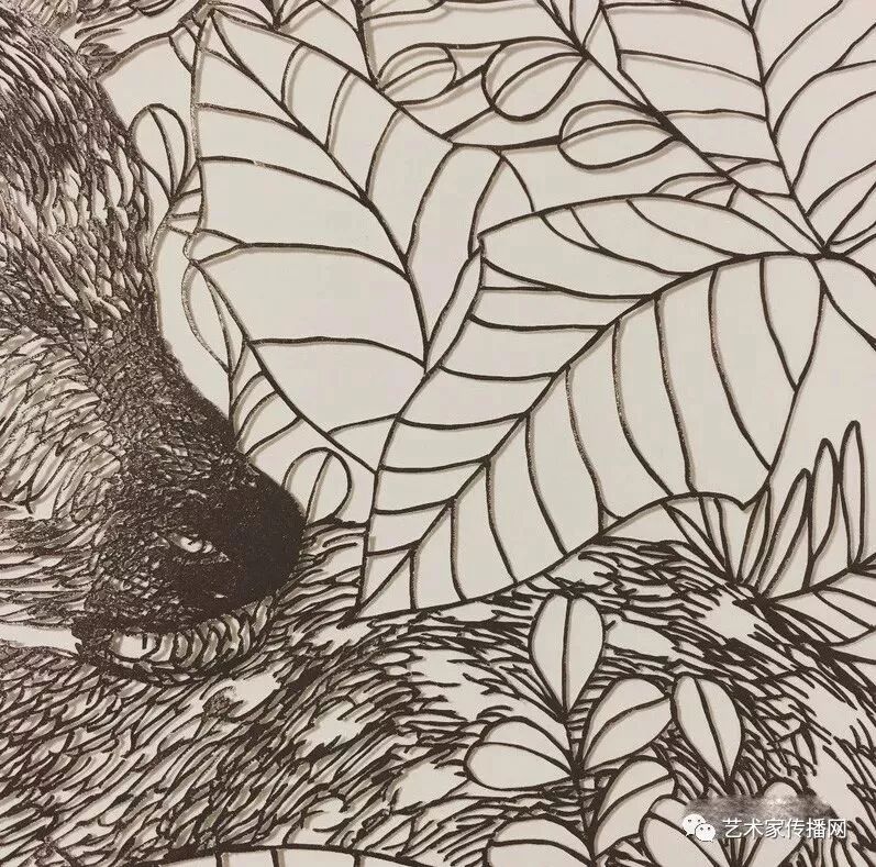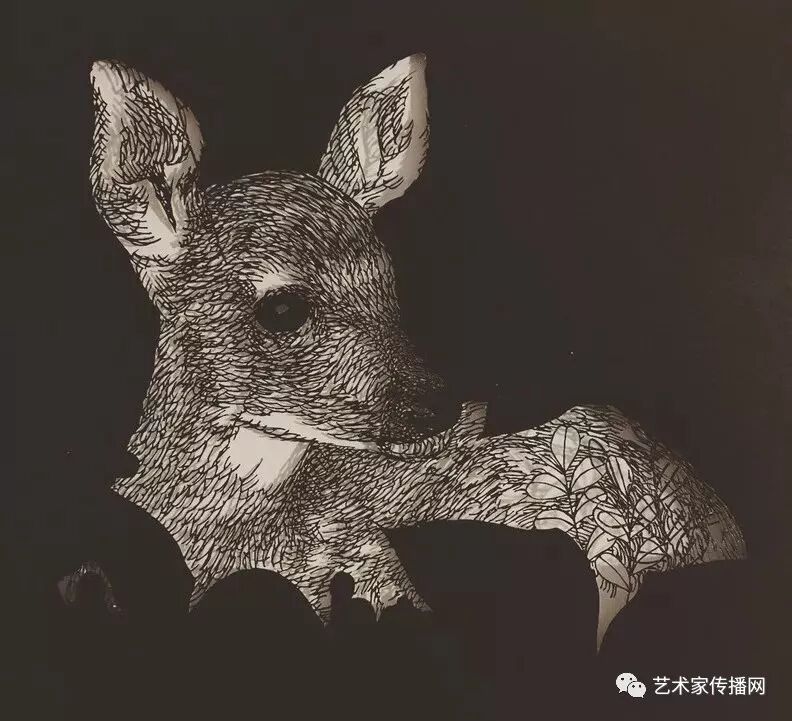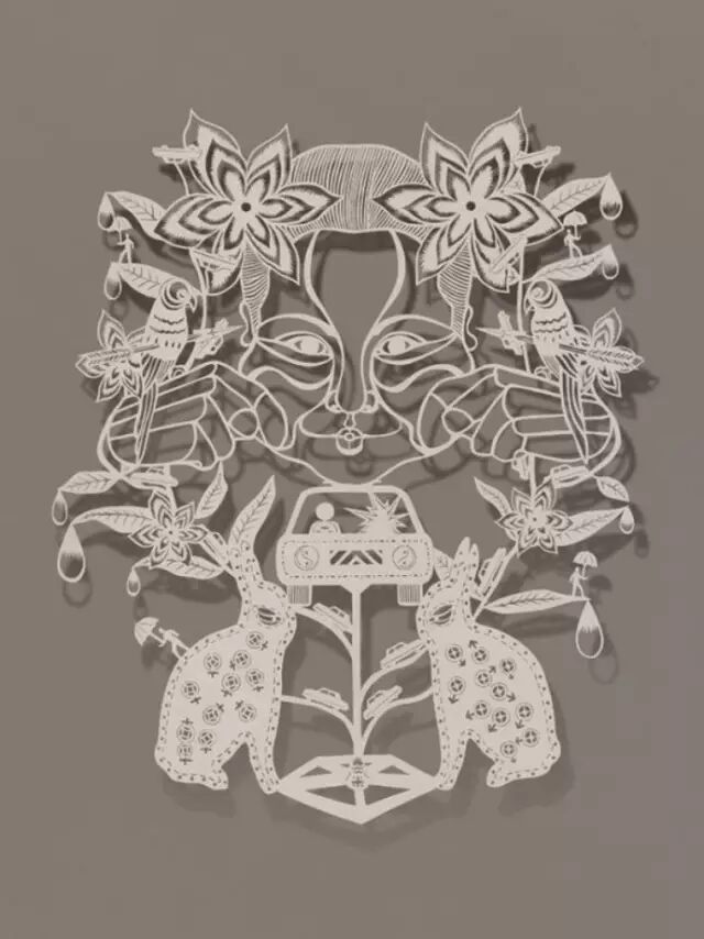 她的作品主题围绕在自然、动物和人类这个永恒的话题,通过创意经常把动物拟人化或者赋予自然植物人类外形。她的每张作品的创作时间都在15个小时左右,这需要极好的耐心以及对手的超强把控,因为画面的细小和精致,有时一刀出现问题就容易毁坏已经完成部分细节的作品。