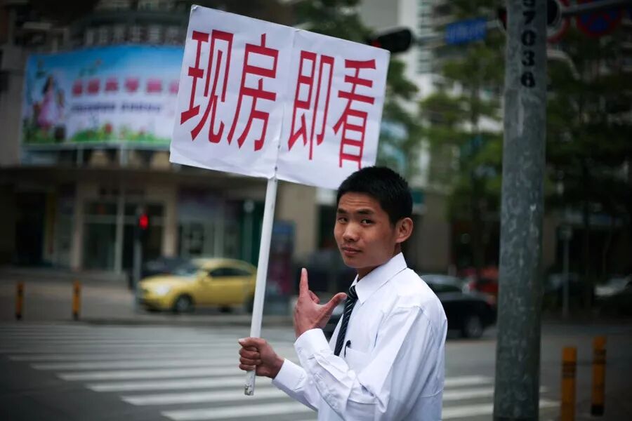 2010年,深圳华侨城街头,房产经纪举着牌子站在街头。