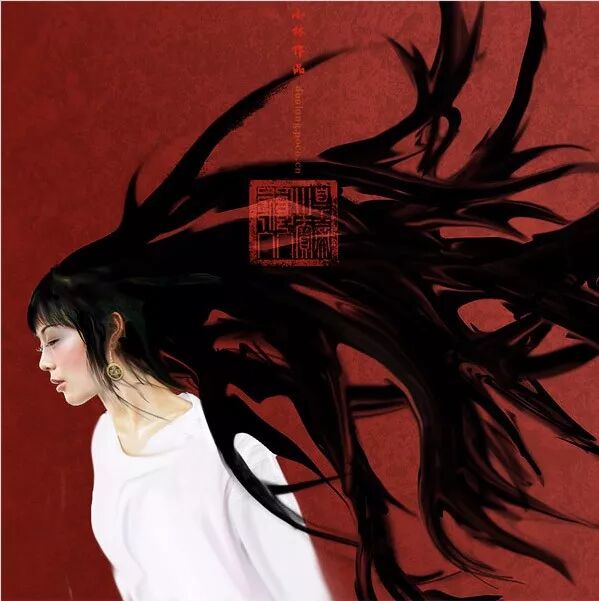 图中的人物长发,是用photoshop里的大拇指功能,一笔一笔拖出来的。