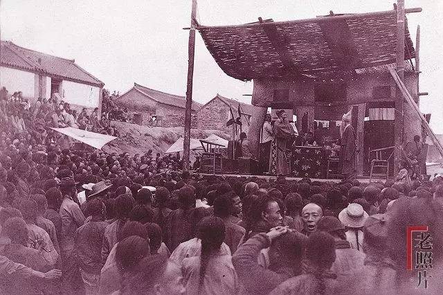 1910年代,山东胶东的一个村庄雇请戏班来村里唱大戏的场面。