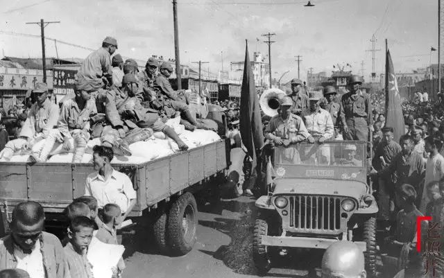 抗战胜利后,新六军是首批进驻南京的中国军队。照片中中国军队雄姿勃发地站在吉普车上胜利开进南京,而擦肩而过的日军则散坐在一辆卡车上落寞地看着庆祝胜利的人群。