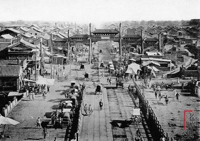 1900年庚子国难后的北京前门大街,照片右侧一片倒塌的房屋,熙熙攘攘的人群中穿着长衫的中国男子与一身制服的外国军官擦肩而过。