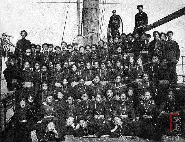19世纪90年代,北洋海军美籍军官马吉芬为“威远”舰士官和练勇(见习水兵)所拍摄的合影照。