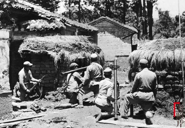 腾冲城外,中国远征军士兵用美式“巴祖卡”火箭筒对据守村落的日军进行攻击。摄于1944年8月1日。